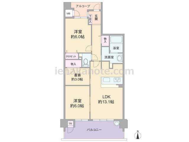 専有面積64.35平米の2SLDK。玄関前には広いポーチ付き。書斎を除き、全室6帖以上・洋室というプラン。キッチンはカウンタータイプで、家事をしながら家族の様子を伺えます。LDK約13.1帖には洋室約6.0帖が隣接しているため、扉を閉めた...