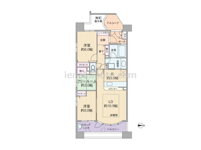 専有面積64.58平米の2SLDK。玄関前にアルコーブとポーチがあり、室内への動線がクランク状になったプライバシーに配慮されたプラン。キッチンはカウンタータイプで、洗面室に直接アクセスできるツーウエイ。リビング・ダイニングの窓は開放感のあ...