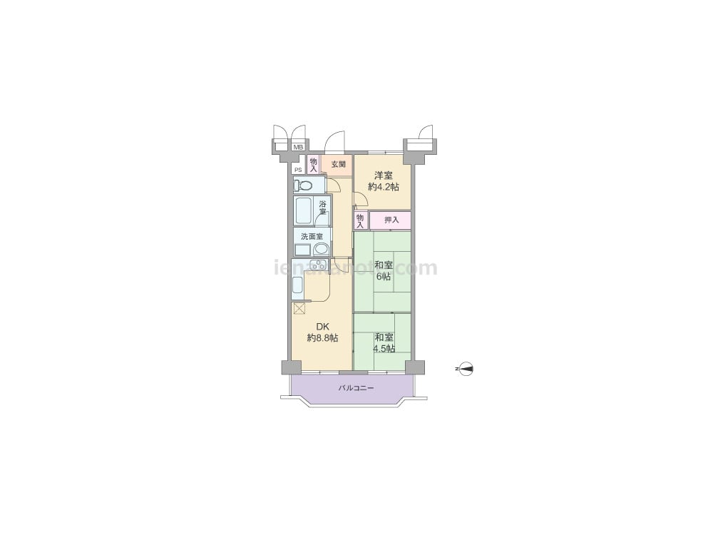 専有面積53.75平米の3DK。DKは約8.0帖ですが、和室4.5帖が続き間となっているため、襖を開放すれば約13.3帖のLDKとしても利用可能。和室4.5帖は和室6帖とも続き間となっており、生活シーンに合わせて、ひと続きの大きな和室としても使えます。