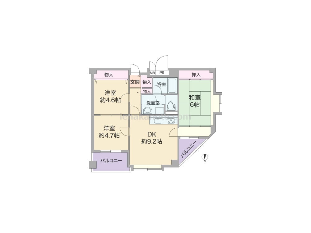 専有面積63.32平米の3DK。北側の開口部に3つの部屋が並んだワイドスパンのキュービックプラン。バルコニーが2ヶ所にあります。廊下が短く、有効専有面積が広く使えます。その分、廊下から直接入ることのできる部屋が少なく、プライバシーが確保しづらい反面、自然と家族で顔を合わせる機会が増え、コミュニケーションが取りやすくなりそうです。