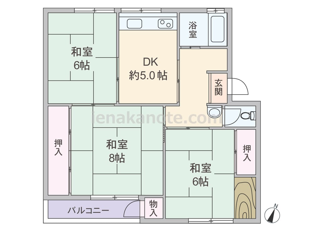 専有面積55.19平米の3DK。ダイニングキッチン以外は和室の落ち着いたプラン。北側の和室6帖へはDKまたは8帖間を通らないとアクセス出来ず、収納スペースも無いため、プライベートスペースとして使用するより家族団らんのリビングスペースに向いています。バルコニーには物入れ付き。キッチンと浴室にも窓があり、換気がよく快適です。
