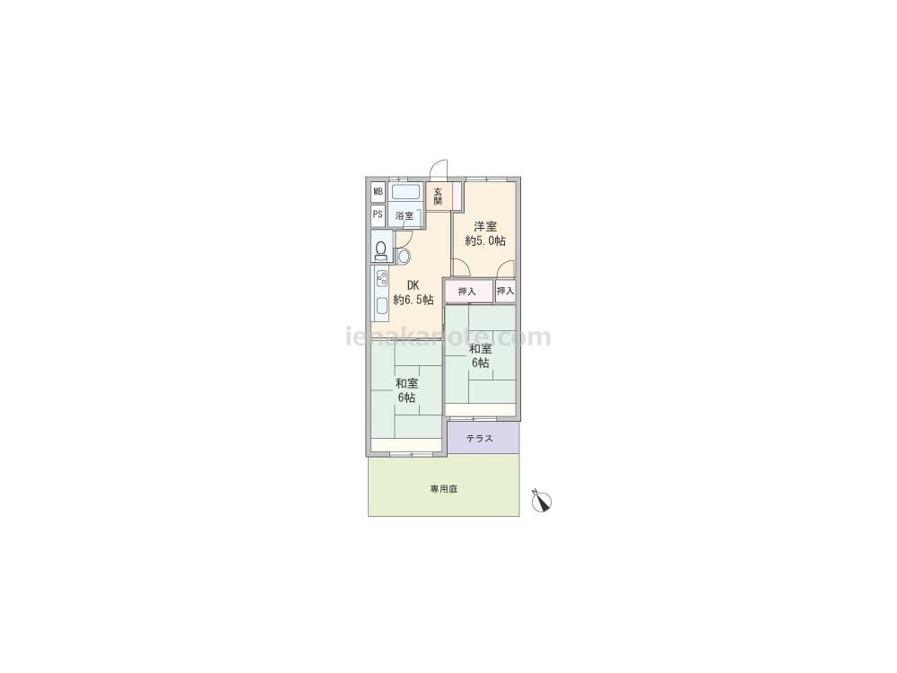 専有面積51.8平米の3DK。玄関を入ってすぐにダイニング・キッチンがある居室空間を優先したプラン。キッチンはI型、壁付けのオープンタイプ。ダイニング・キッチンと和室が続き間で、繋げたり、区切ったりと生活シーンに合わせてフレキシブルに使用可能。テラス、専用庭があり、ガーデニングや家庭菜園も楽しめます。