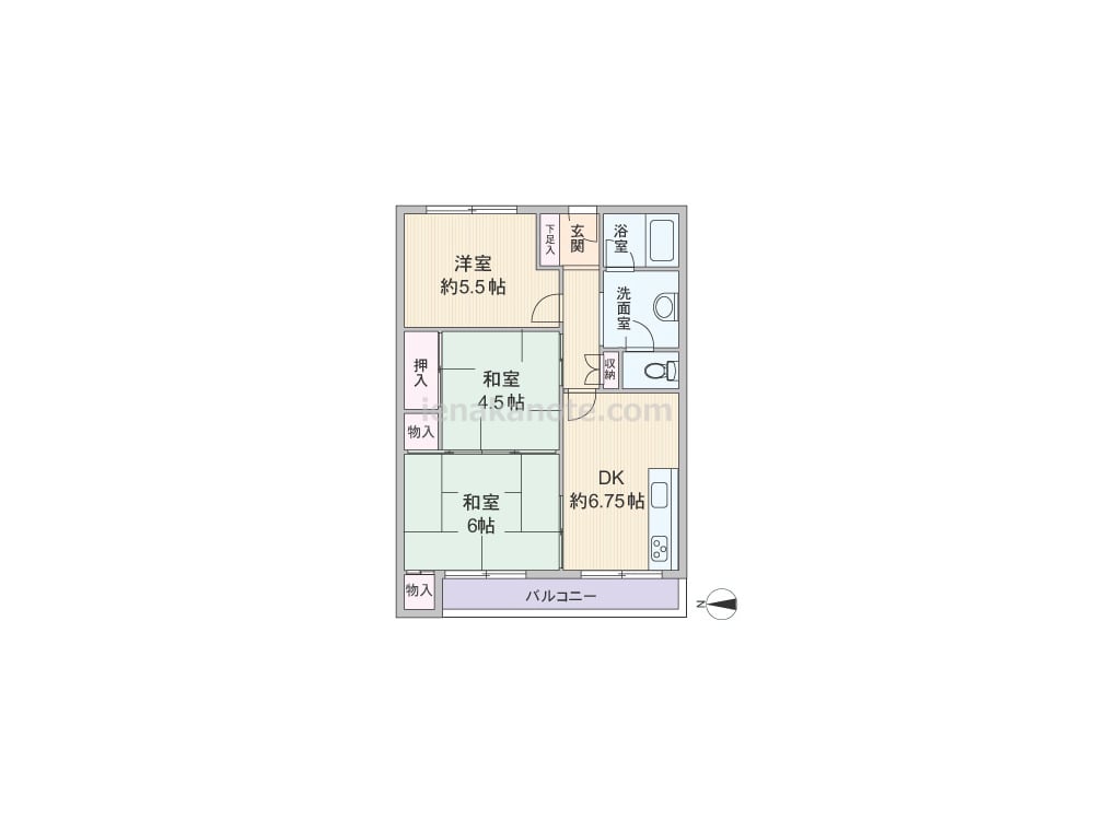 専有面積51.84平米の3DK。玄関扉が内開きで、玄関スペースは限られますが防犯にすぐれています。キッチンは壁付け・オープンタイプ。和室約4.5帖と約6帖は、襖を開放して空間を広く使ったり、個室に利用したりと、生活シーンに合わせてフレキシブルに使用出来ます。洗面室からトイレに出入りする造り。洋室約5.5帖のみ収納が無い為、収納家具を設置するなどの工夫が必要です。