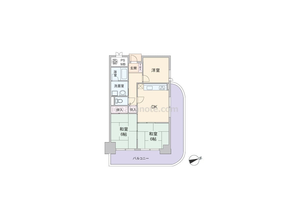専有面積54.43平米の3DK。共用廊下に直接面する居室が無い、プライバシーが確保されたプラン。キッチンは壁付け・オープンタイプで、ダイニングを広く使える配置です。和室はそれぞれ続き間になっており、襖を開放して部屋を繋げて使用したり、個室に利用したりと、生活シーンに合わせてフレキシブルに使えます。収納スペースは室内廊下と和室6帖のみの為、収納家具を設置するなどの工夫が必要です。