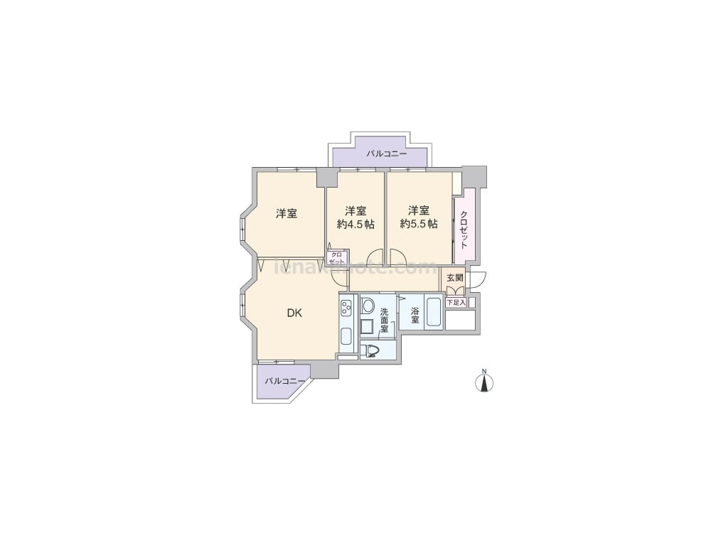 専有面積52.28平米の3DK。共用廊下に直接面する住居の窓が無く、プライバシーが確保されたプラン。キッチンは壁付け・オープンタイプでダイニングスペースを広く使える配置。DKと続き間になった洋室は、リビングスペースとしても使える一室。洗面室からトイレに出入りする造りで、洗面室・トイレ使用時の動線が重なっています。洋室約5.5帖と洋室約4.5帖に収納スペース付き。バルコニーが南・北2カ所にあります。