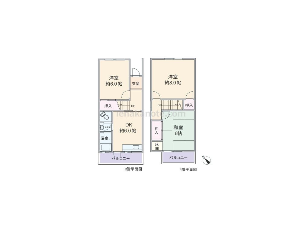 専有面積60.75平米の3DK。一戸建て感覚のメゾネットタイプ。全室6帖以上の広さがあり、主寝室は約8.0帖とゆったりしています。壁付け・オープンタイプのキッチンはバルコニーに面しており、浴室にも窓があり換気がしやすく快適。和室6帖には床の間があり本格的な和の雰囲気を味わえます。各部屋に収納スペースがありますが、主寝室約8.0帖は容量が少ないため収納家具を置くなど少し工夫が必要。トイレは洗面室を通って出入りするためトイレ・洗面室使用時の動線が重なっています。