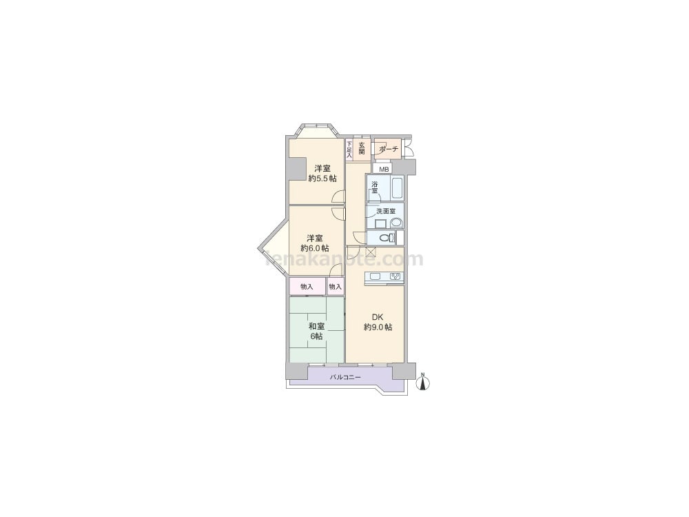 専有面積63.22平米の3DK。玄関前にポーチ付き。共用廊下に直接面する住居の窓が無く、室内への動線がL字になった玄関から居室が見通せないプライバシーに配慮されたプラン。カウンタータイプのキッチンは家事をしながら家族とコミュニケーションが取りやすい配置。約9.0帖のDKに隣接する和室6帖の襖を開放すれば、約15.0帖大の空間としても使えます。洋室約5.5帖には収納がなく、洋室6帖の収納は容量が少ないため、家具を置くなどの工夫が必要。どの部屋にも窓があり、明るく・通風にすぐれています。