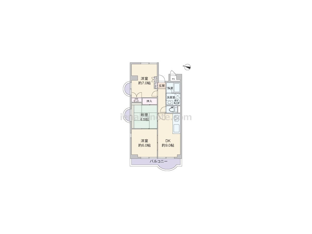 専有面積63.21平米の3DK。DK約9.0帖と、和室4.5帖、洋室約6.0帖が続き間になっており、襖を開放して空間を広げて使用したり、それぞれ個室に利用するなどフレキシブルに使えるプラン。主寝室約7.0帖には収納スペースが2カ所あります。洋室約6.0帖には収納スペースが無いため、収納家具を置くなど少し工夫が必要。バルコニーは一部半円形に張り出した形状です。