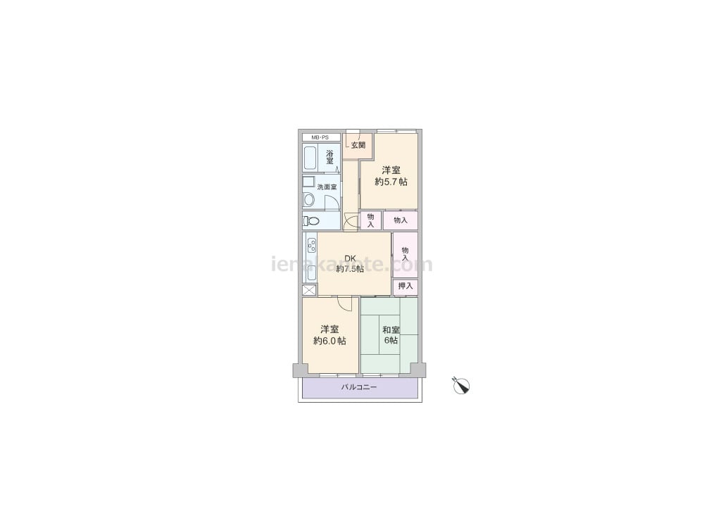 専有面積60.5平米の3DK。玄関扉は内開きのため玄関スペースは限られますが、防犯性にはすぐれています。リビングが部屋の中心にあるセンターリビングのプラン。洋室約6.0帖には収納スペースがありませんが、DK約7.5帖に収納力のある物入付き。トイレは洗面室を通って出入りするため、トイレ・洗面室使用時の動線が重なっています。