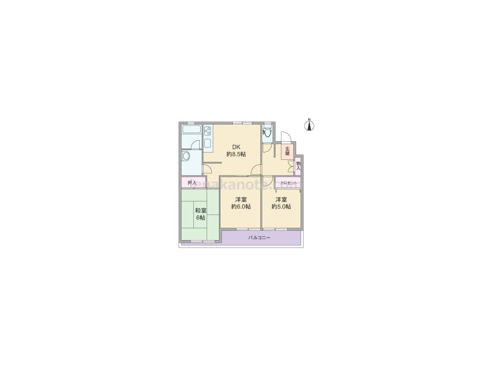 専有面積57.17平米の3DK。ワイドスパンのプランで、3室が南向き。キッチンはI型、壁付けのオープンタイプ。ダイニング・キッチンと洋室6帖が続き間で、つなげて約14.5帖の一つの空間としても使用可能。トイレと浴室にも窓があり、換気にすぐれ快適です。