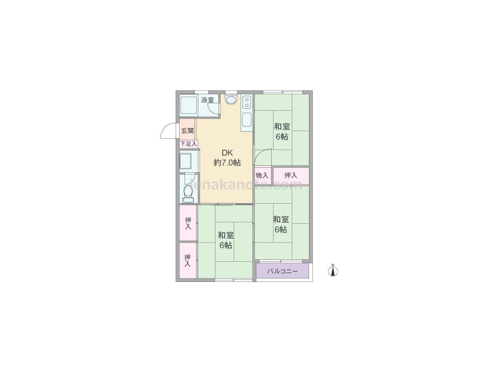 専有面積57.79平米の3DK。室内廊下が無い、玄関を入るとDK約7.0帖が広がる、居住空間を優先したプラン。どの部屋も6帖のゆとりがあり、襖を開放すれば空間を広々と使う事も出来ます。各居室に収納スペース付き。浴室の前に壁で仕切られた洗面室(脱衣場)が無いため、目隠しを置くなど少し工夫が必要。浴室と洗面台の前には窓があり、換気がしやすく快適です。
