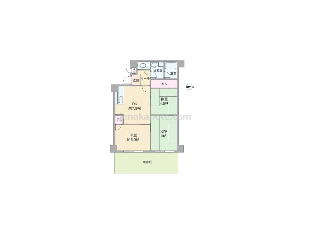 専有面積49.18平米の3DK。専用庭付きのプラン。居室の窓が共用廊下に直接面していないため、プライバシーを保つ事が出来ます。どの部屋もDK約7.9帖を通って行き来する造り。続き間になった部屋の扉を開放すれば、生活シーンに合わせて空間をレイアウト出来ます。和室6帖には収納スペースが無いため、家具を置くなど少し工夫が必要です。専用庭約6.89平米は、ガーデニングや家庭菜園なども楽しめます。