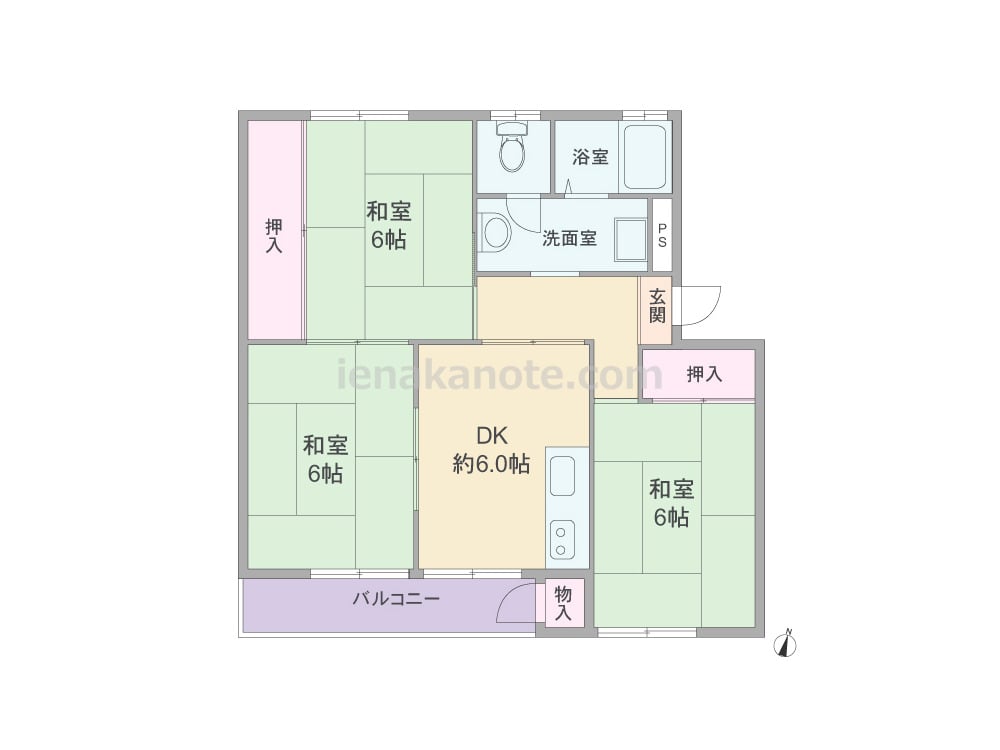 専有面積54.25平米の3DK。全室6帖のゆとりがあるプラン。DK以外は和室の落ち着いた造りです。東側の和室は独立した配置で、それ以外の部屋は続き間になっています。DKに隣接する和室には押入が無いため、家具を置くなど少し工夫が必要です。トイレは洗面室を通って出入りし、トイレ・浴室の窓は換気がしやすく快適。バルコニーに物入があります。