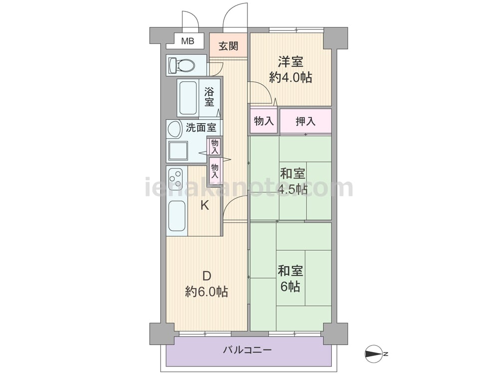 専有面積57.5平米の3DK。和室2部屋とダイニングが続き間になっているプラン。和室を10.5帖の一室に利用したり、ダイニングと繋げて約12.0帖の空間にしたりと、自由に間取りを変更できます。室内廊下と洗面室の物入は日用品を収納するのにぴったり。バルコニーに面する和室のみ収納がありません。