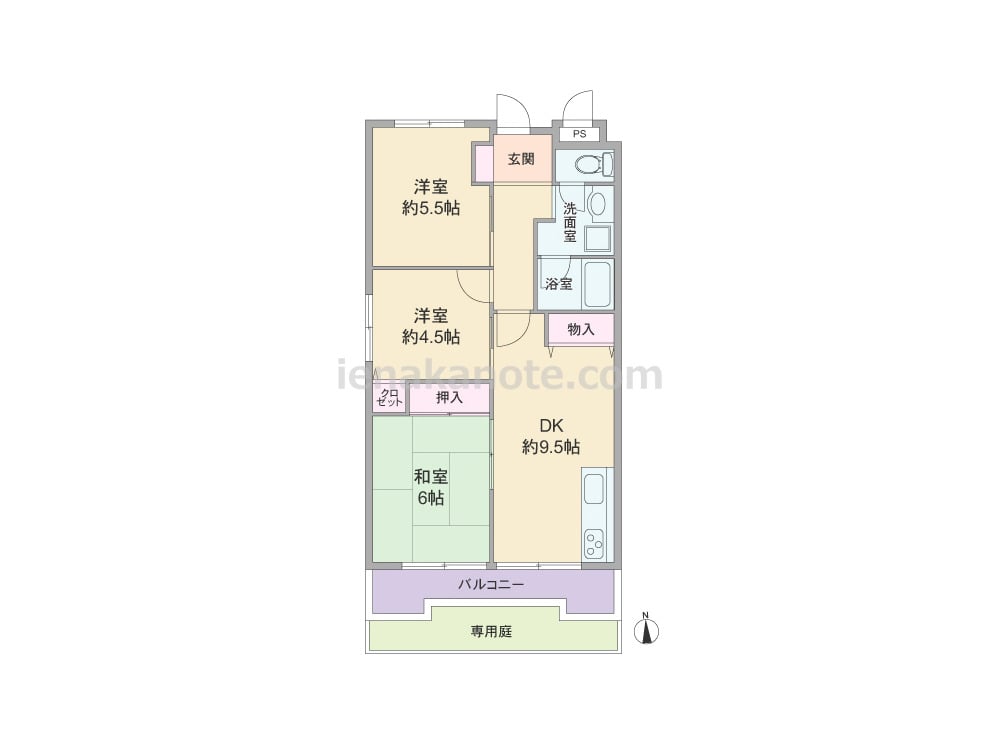 専有面積57.31平米の3DK。専用庭があるプラン。DK約9.5帖と洋室約4.5帖、和室6帖が続き間になっており、キッチンは空間を有効利用できるI型の壁付け・オープンタイプ。全部屋に窓があります。洋室約5.5帖にはクロゼットがありませんが、その他の居室とDK約9.5帖に収納スペース付き。トイレは洗面室を通って出入りするため、トイレ・洗面室使用時の動線が重なっています。