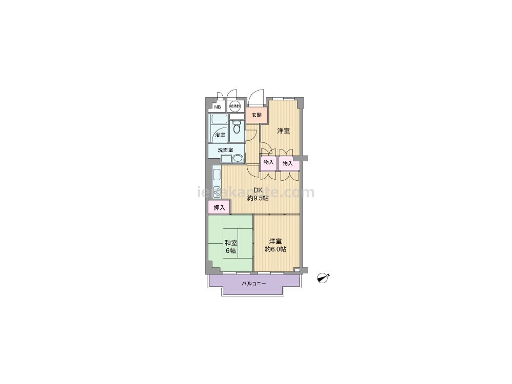 専有面積60.11平米の3DK。DK約9.5帖が部屋の中央にあるプラン。DKに隣接する洋室約6.0帖は、引き戸を開放すればLDK約15.5帖大にする事が可能。和室6帖とも続き間のため、生活シーンにあわせてフレキシブルにプラン変更が出来ます。洋室約6.0帖には収納スペースがありませんが、その他の居室とLDKに収納スペース付きです。