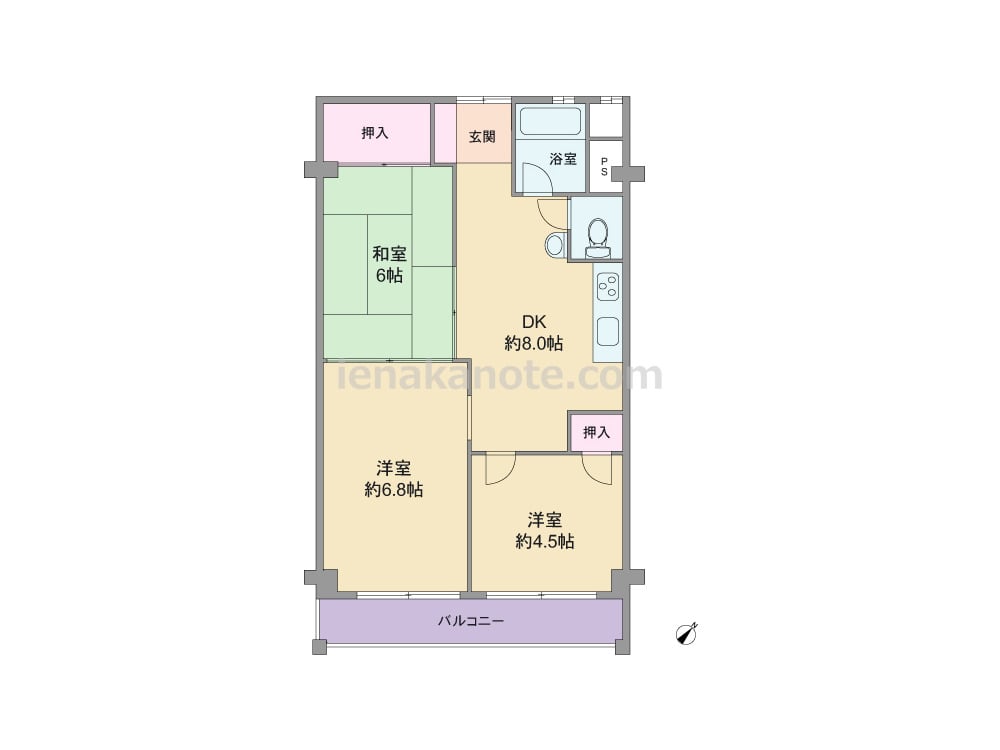 専有面積51.84平米の3DK。どの部屋もDK約8.0帖を通って行き来する、家族のコミュニケーションの機会が増えるプラン。和室6帖はDK約8.0帖、洋室約6.8帖と続き間で、引き戸を開放すれば空間を広々と使う事が出来ます。キッチンは開放的なI型の壁付け・オープンタイプ。洗面室(脱衣場)は個室仕様ではないため目隠しを設けるなどの工夫が必要です。収納は洋室約4.5帖、和室6帖に設けられています。