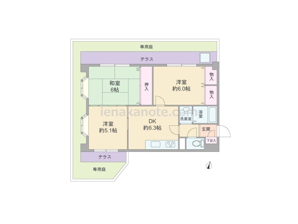 専有面積49.89平米の3DK。専用庭が付いたプラン。共用廊下に居室の窓が面していないため、プライバシーを保ちやすい造りです。DK約6.3帖、洋室約5.1帖、和室6帖は続き間で、引き戸を開放すれば空間を広々と使う事が出来ます。洋室約5.1帖には収納スペースが無いため家具を置くなど少し工夫が必要。専用庭約17.60平米、テラス約11.59平米の広さがあり、洗濯機置場はテラスに設けられています。