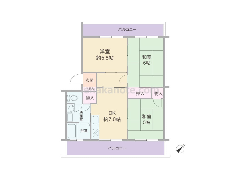 専有面積51.93平米の3DK。全室+浴室の窓がバルコニーに面する通風・採光にすぐれたプラン。居室の窓が共用廊下に直接面していないため、プライバシーを保ちやすいのも特徴です。和室はどちらも続き間で、襖を開放してDK約7.0帖、洋室約5.8帖と空間をつなげて使う事も可能。洋室約5.8帖にはクロゼットがありませんが、和室と洗面室に収納スペースが設けられています。浴室の窓は湿気がこもりにくく快適。バルコニーは約15.47平米あります。
