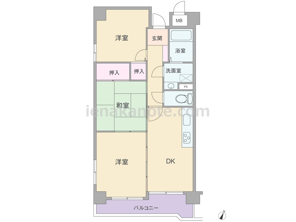専有面積50.44平米(内法)の3DK。居室の窓が共用廊下に面していない、プライバシーを確保したプラン。バルコニーに面する洋室には収納がありませんが、二面採光の明るい一室です。また、和室とダイニング・キッチンに隣接しており、引き戸を開放すれば空間を広々と使う事が可能。和室は室内廊下からも出入りできます。