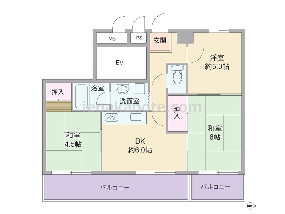 専有面積50.54平米の3DK。DK約6.0帖を含む3部屋がバルコニーに面するプラン。全部屋続き間になっており、和室6帖はDKと洋室約5.0帖の2カ所からアクセス可能。引き戸を開放すれば空間を広げて使う事が出来ます。洋室約5.0帖には収納が無いため、家具を配置するなど少し工夫が必要です。バルコニーは約14.02平米とスペースにゆとりがあります。