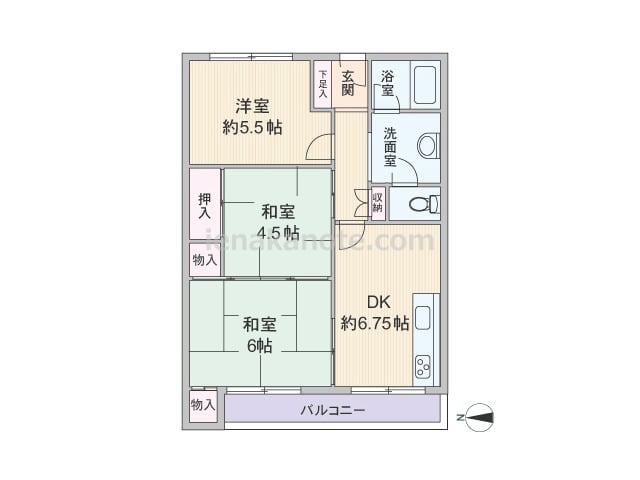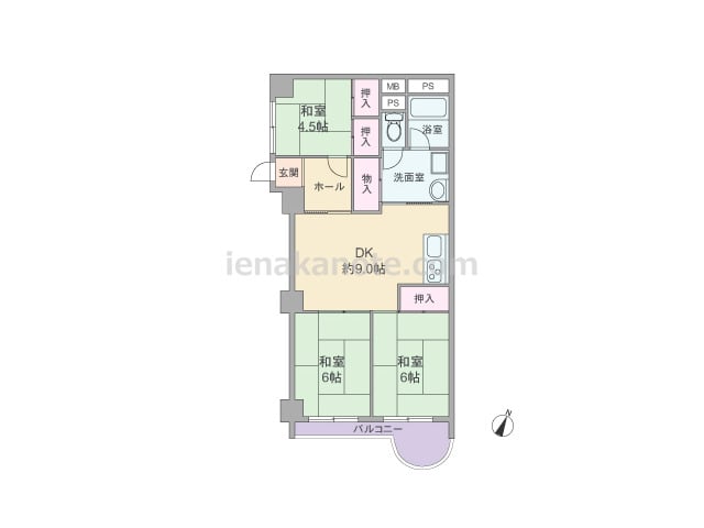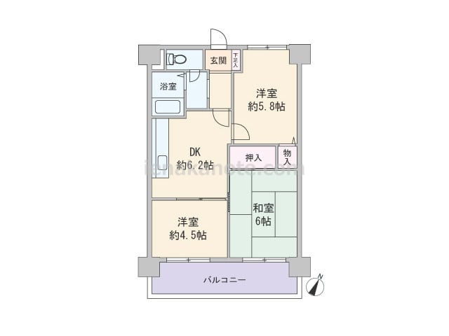 専有面積46.63平米の3DK。中央にDKがあるプラン。どの部屋にも一度ダイニングキッチンを通ってアクセスするため家族のコミュニケーションの機会が増えます。洋室約4.5帖には収納スペースが無いため、収納家具を置いたり、扉を開放してリビング...