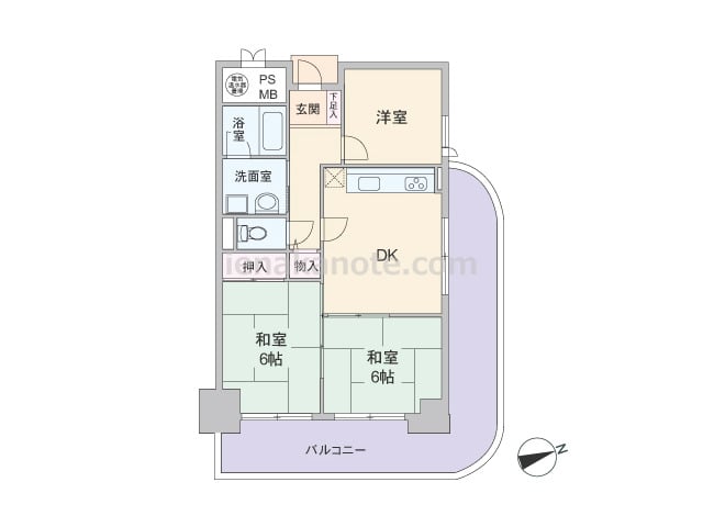 専有面積63.36平米の3LDK。共用廊下に直接面する居室が無いためプライバシーが確保されたプラン。室内廊下の面積が少なく、キッチンも壁付け・オープンタイプで居室空間を優先した造り。ダイニングキッチンに隣接する和室の襖を開放すれば約13....