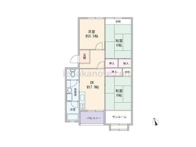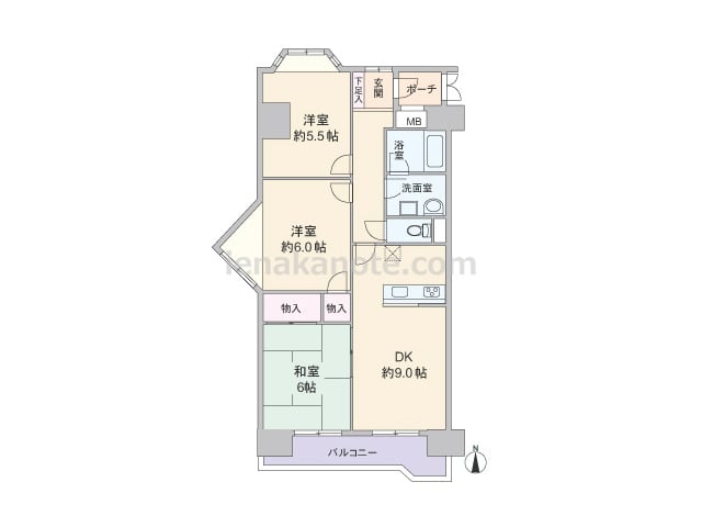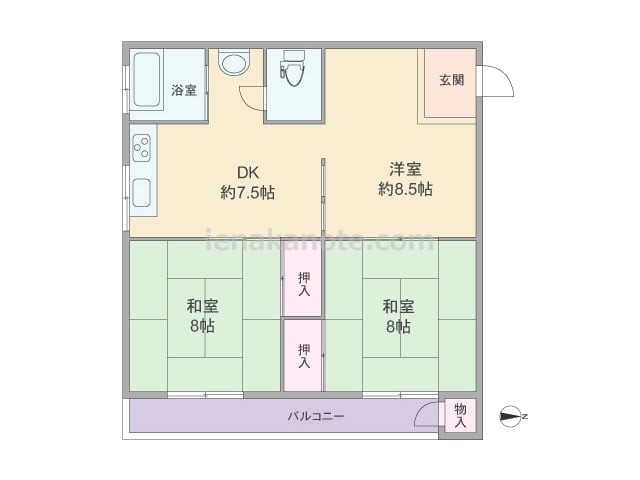 専有面積60.15平米の3DK。DK以外は和室の落ち着いたプラン。玄関から居室が見通せない造りでプライバシーが確保されています。壁付け・オープンタイプのキッチンはダイニングスペースを有効に使える配置。洗面室には出幅のある物入がありますが、...