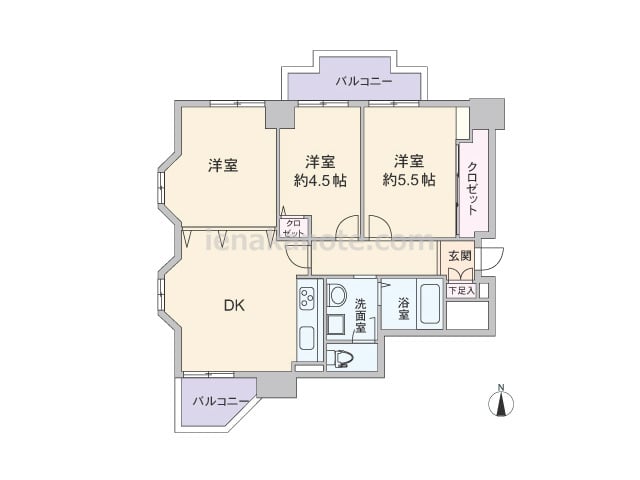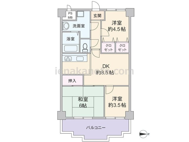 専有面積52.2平米の3DK。部屋の中央にDK約8.5帖があり、奥まった配置のキッチンは空間を有効利用できる造り。洋室約4.5帖はDKとの間を壁+クロゼットで遮られており、書斎や受験生の勉強部屋によさそうです。和室6帖、洋室約3.5帖へは...