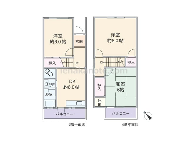 専有面積60.75平米の3DK。一戸建て感覚のメゾネットタイプ。全室6帖以上の広さがあり、主寝室は約8.0帖とゆったりしています。壁付け・オープンタイプのキッチンはバルコニーに面しており、浴室にも窓があり換気がしやすく快適。和室6帖には床...