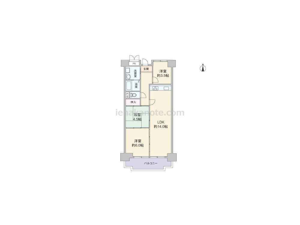 専有面積61.40平米の3LDK。玄関ホールはややゆとりのある空間。キッチンはLDKを広く使えるI型壁付けのオープンタイプ。LDKと2部屋が続き間で、繋げたり、区切ったり、生活シーンに合わせてフレキシブルに使用可能。収納スペースは和室の1間の押入のみで、収納家具を置くなど、工夫が必要です。