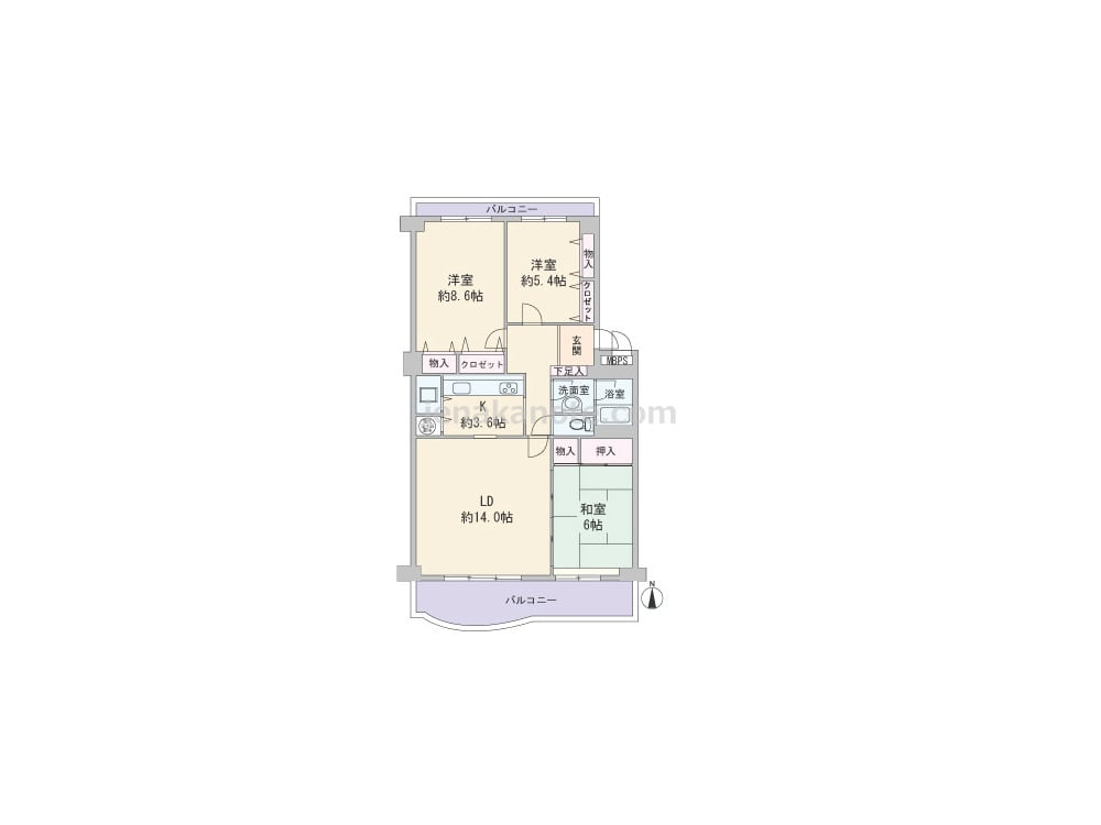 専有面積89.39平米の3LDK。キッチンは独立型。キッチン横に洗濯機置場がある、家事効率に配慮されたプラン。リビングダイニングは約14.0帖大とゆとりがあり、和室6帖の襖を開放すれば空間をより広く使う事が出来ます。各居室に収納スペース付き。南北両面にバルコニーがあります。