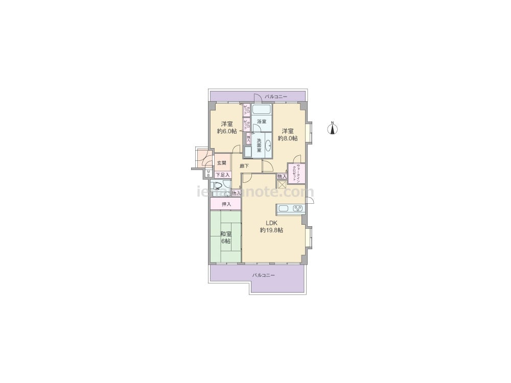 専有面積86.23平米の3LDK。センターインのプランで、南北両面にバルコニー付き。全居室がバルコニーに面しており、LDKと主寝室約8帖は開放感のある二面採光。キッチンは家事中も家族に目が届くI型の対面式。LDKと和室をつなげて、約25.8帖の一つの空間としても使用可能。各部屋に収納スペースがあり、主寝室にウォークインクロゼット付き。浴室もバルコニーに面して配置され、湿気がこもりにくい窓付き。南側のバルコニーは出幅があります。