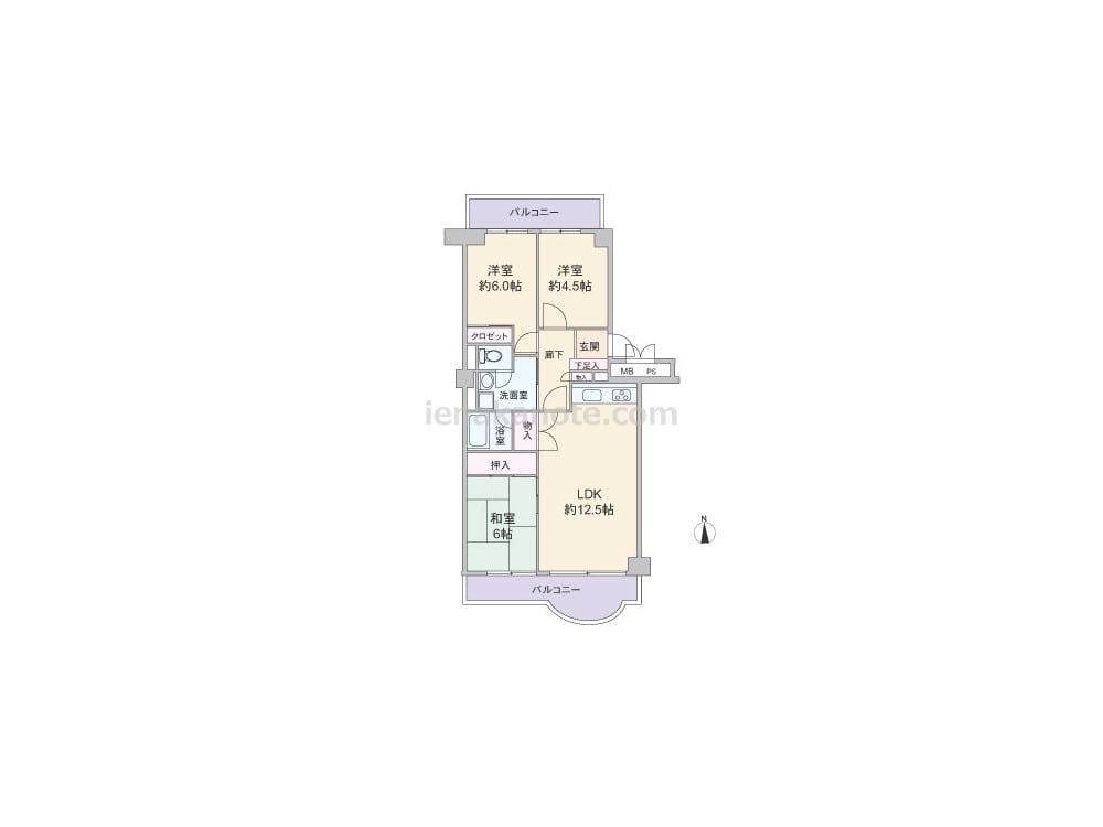 専有面積70.23平米の3LDK。全部屋バルコニーに面する、通風・採光に配慮されたプラン。LDKは約12.5帖、キッチンは壁付け・オープンタイプ。LDKと室内廊下に物入付き。洋室約4.5帖には収納スペースが無いため、収納家具を置くなど少し工夫が必要です。トイレは洗面室を通って出入りする造りでトイレ・洗面室使用時の動線が重なっています。