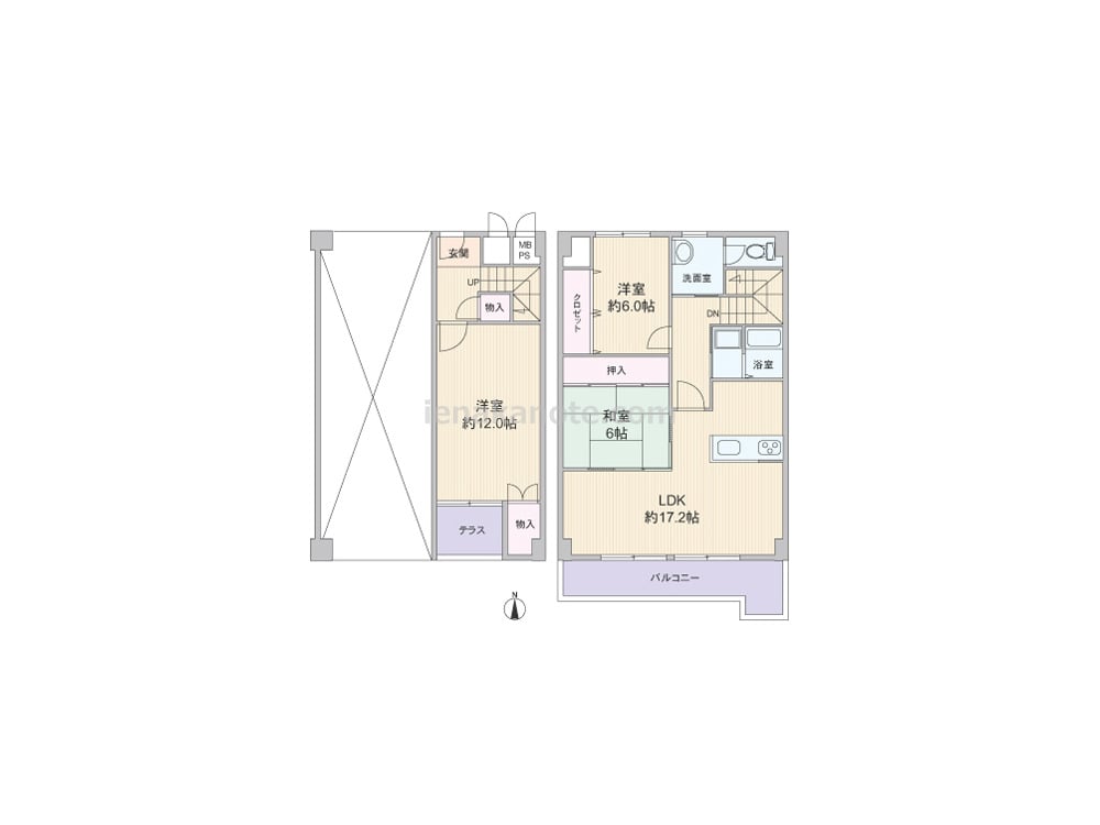 専有面積94.86平米の3LDK、メゾネットタイプ。下階は主寝室約12.0帖と収納スペースがあり、上階にLDKや水周りが設けられたプラン。LDKは約17.2帖大と広く、キッチンは家事をしながら家族とコミュニケーションが取れるカウンタータイプ。和室6帖の襖を開放すればLDKをより広く使う事が出来ます。和室と洋室約6.0帖には収納力のある収納スペース付き。洗面室と洗濯機置場(脱衣室)がわかれて配置されており、洗面室・脱衣室使用時の動線が重なっていないのがポイント。バルコニーは約14.76平米とゆとりがあり、テーブルセットを出してお茶をしたり、ガーデニングを楽しむのによさそうです。