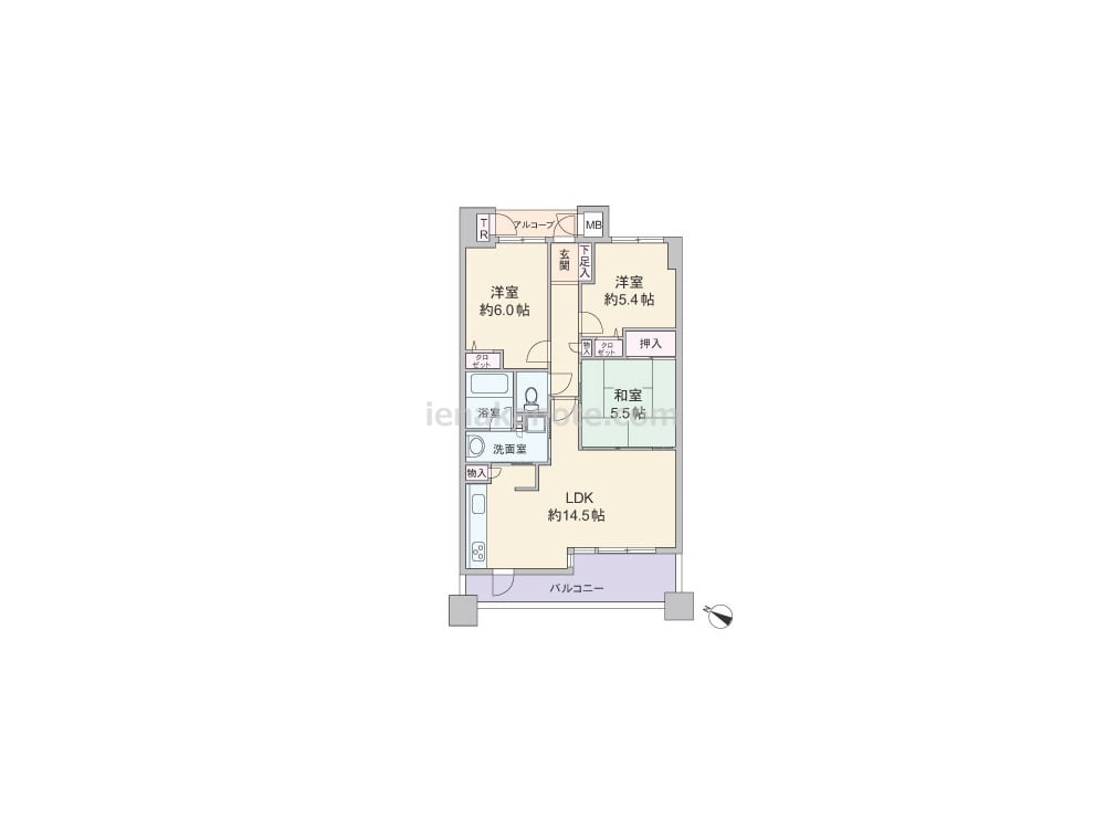 専有面積69.04平米の3LDK。玄関前にアルコーブとトランクルーム付き。LDKは約14.5帖。キッチンは壁付け・オープンタイプでバルコニー・洗面室へアクセス可能な3WAY動線。和室は2カ所から出入りでき、LDK側の襖を開放すれば約20.0帖大の空間に。各居室に収納スペースが設けられていますが洋室2部屋は容量が少なめなため、収納家具を置くなど少し工夫が必要。バルコニーは約11.56平米とゆとりがあります。
