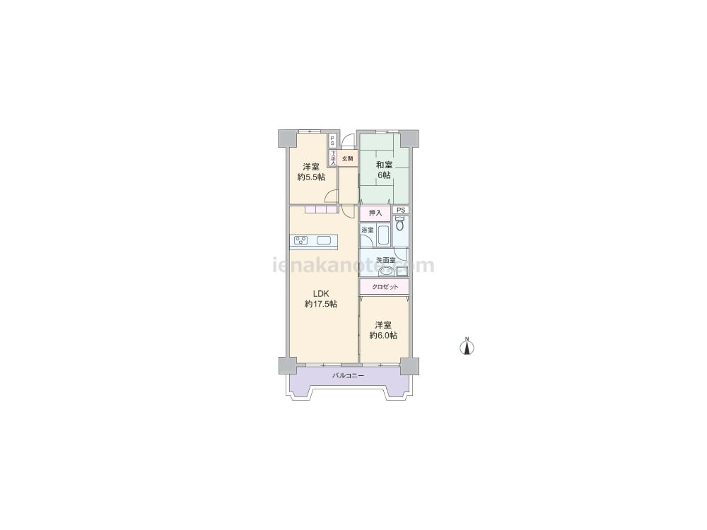 専有面積73.35平米の3LDK。LDKは約17.5帖大と広く、キッチンは家事をしながら家族とコミュニケーションが取りやすいカウンタータイプ。洋室約6.0帖の扉を開放すれば、LDK約23.5帖大として使う事が出来ます。玄関横の和室は客間にも使える一室。洋室約5.5帖には収納スペースが無いため収納家具を置くなど少し工夫が必要。トイレは洗面室を通って出入りする造りで、トイレ・洗面室使用時の動線が重なっています。