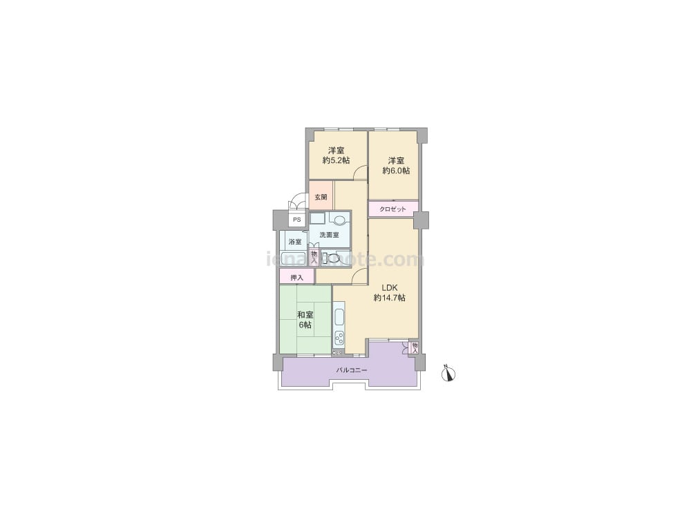 専有面積73.33平米の3LDK。LDK約14.7帖は2カ所から出入りでき、間仕切りを作れば4LDKに間取り変更が可能。(リフォーム費用必要)キッチンはバルコニーに面し、料理中窓を開けて換気する事が出来ます。洋室約5.2帖には収納スペースが無いため、収納家具を置くなどの工夫が必要。バルコニーは約12.54平米の広さがあり、物入も設けられています。