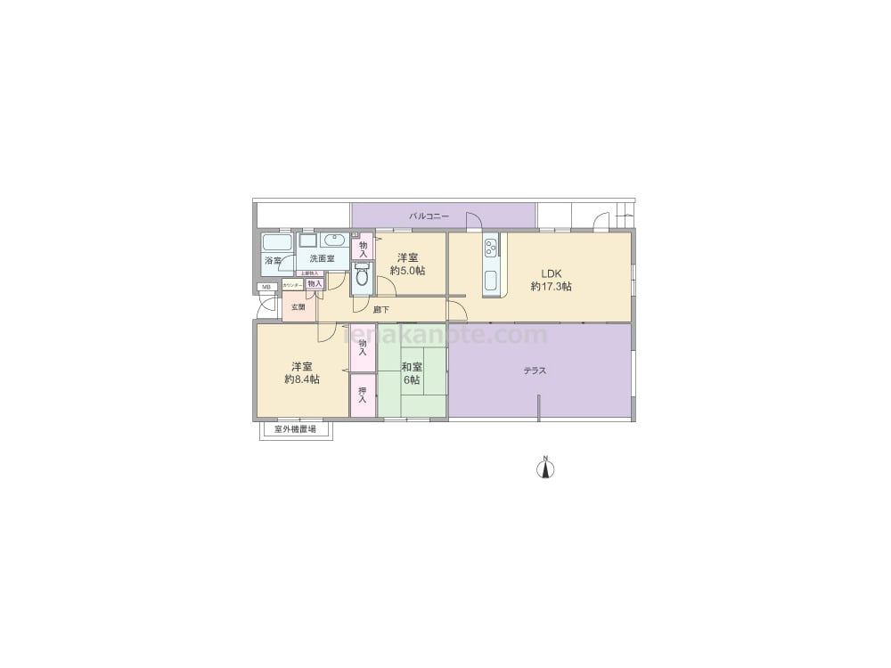 専有面積84.01平米の3LDK。LDKは約17.3帖大とゆとりがあり、カウンタータイプのキッチンは料理をしながら家族とコミュニケーションが取りやすい配置。キッチン横にはバルコニー(約15.28平米)への勝手口があります。各居室に収納スペースが設けられ、浴室・洗面室の窓は換気がしやすく快適。テラスは約28.58平米大と大変広く、ガーデニングをしたり、テーブルセットを置いて食事やティータイムを楽しむアウトドアリビングの利用にぴったりです。