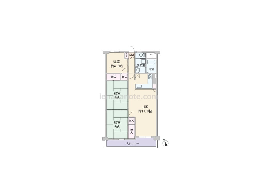 専有面積71.42平米の3LDK。LDKは約17.0帖大と広く、L字型・カウンタータイプのキッチンは家事をしながら家族とコミュニケーションが取りやすい配置。和室2部屋とLDKは続き間になっており、それぞれ個室にしたり、襖を開放して空間を広げて使用するなど、生活シーンに合わせて自由に使う事が出来ます。収納スペースが各所に設けられているのもポイント。トイレにも窓がありますが、トイレには洗面室を通って出入りする造りのため、洗面室・トイレ使用時の動線が重なっています。