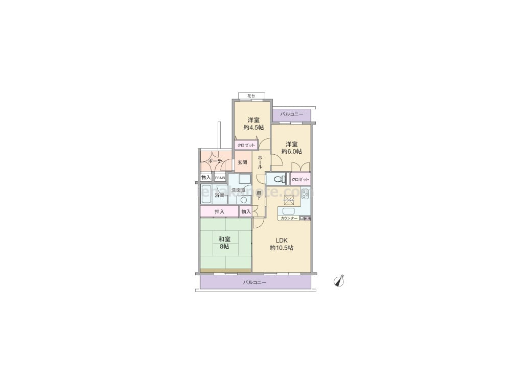 専有面積82.99平米の3LDK。共用廊下に居室の窓が面しておらず、玄関前に専用ポーチが付いたプライバシー重視のプラン。LDKは約10.5帖、キッチンはL字型・カウンタータイプ。和室8帖の襖を開放すれば、約18.5帖大の空間としても使う事が出来ます。各居室と室内廊下に収納スペースが設けられ、洋室約4.5帖にはガーデニングを楽しめる花台付き。バルコニーも2カ所にあります。