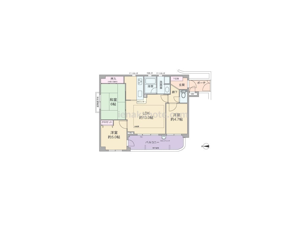 専有面積60.9平米の3LDK。玄関前に専用ポーチがあり、玄関から居室を見通せない造りでプライバシーを確保。LDKは約13.0帖、和室6帖の襖を開放すれば約19.0帖大の空間としても利用できます。キッチンは一部にカウンターがあり、キッチン・洗面室・浴室には換気に配慮された窓があるのもポイント。洋室約4.7帖にはクロゼットが無いため、収納家具を置くなど少し工夫が必要。バルコニーにあるスロップシンクは、ガーデニングを楽しんだり、キッチンの流し台や洗面室では洗いにくい汚れ物などを扱うのに便利です。