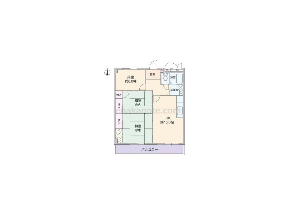 専有面積74.4平米の3LDK。LDKは約13.0帖、キッチンはI型の壁付け・オープンタイプ。洋室約6.0帖には収納スペースが無いため、和室の押入れを利用するなど少し工夫が必要です。和室2部屋とLDKが続き間になっており、和室の間の襖を開放して14帖大の一室にしたり、和室8帖とLDK側の襖を開放して約21.0帖大のLDKにするなど、生活シーンに合わせてフレキシブルに使う事が出来ます。