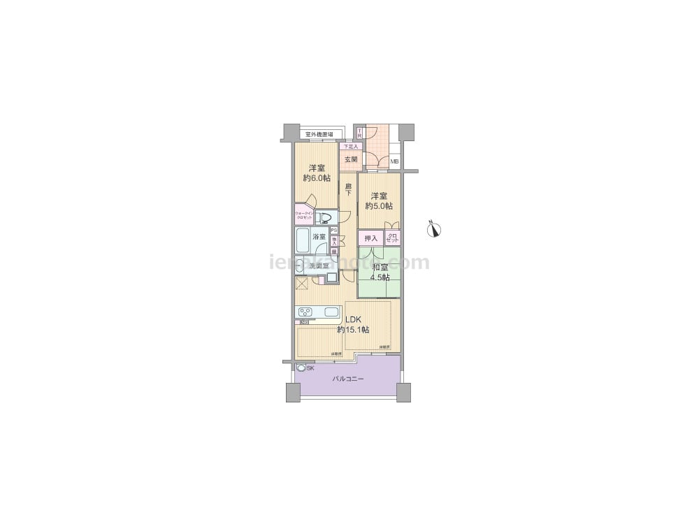 専有面積70.8平米の3LDK。玄関は共用廊下に直接面しておらず、玄関から居室が見通せない、プライバシーに配慮されたプラン。玄関ホールには通風に配慮された窓があるのもポイントです。LDK約15.1帖は明るく開放感のあるコーナーサッシが用いられ、隣接する和室4.5帖の襖を開放すれば約19.6帖大の空間に。カウンタータイプのキッチンは作業をしながら家族とコミュニケーションが取りやすく、キッチンから洗面室へ行き来が可能な2WAY動線。各居室と室内廊下に収納スペースが設けられています。スロップシンク付きのバルコニーは約13.28平米大の広さがあり、テーブルセットを出してくつろいだり、ガーデニングを楽しむのにぴったりです。