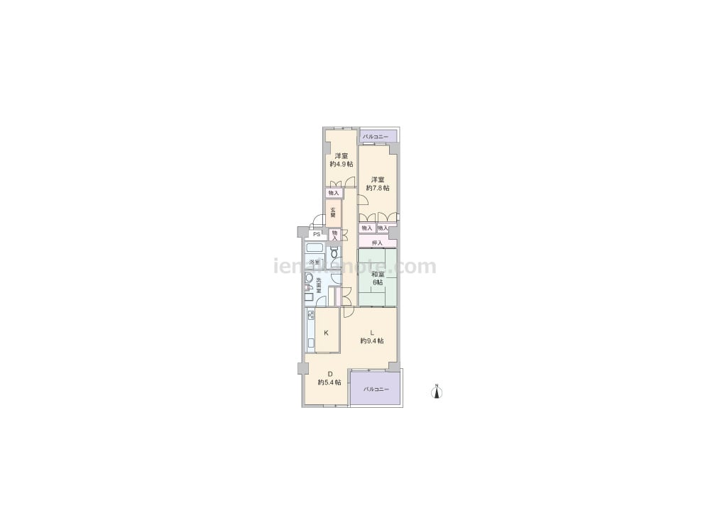 専有面積89.22平米の3LDK。居室の窓が共用廊下に面していない、センターインのプラン。リビングは約9.4帖、ダイニングは約5.4帖大あり、ダイニング側には開放感のあるコーナーサッシが用いられています。独立タイプのキッチンは洗面室にも出入りが可能な家事効率の良い造り。和室は出入り口が2カ所あり、リビング側の襖を開放すればリビングをより広く使う事が出来ます。各居室と室内廊下に収納スペースが設けられ、南北両面にあるバルコニーはガーデニングを楽しむのによさそうです。
