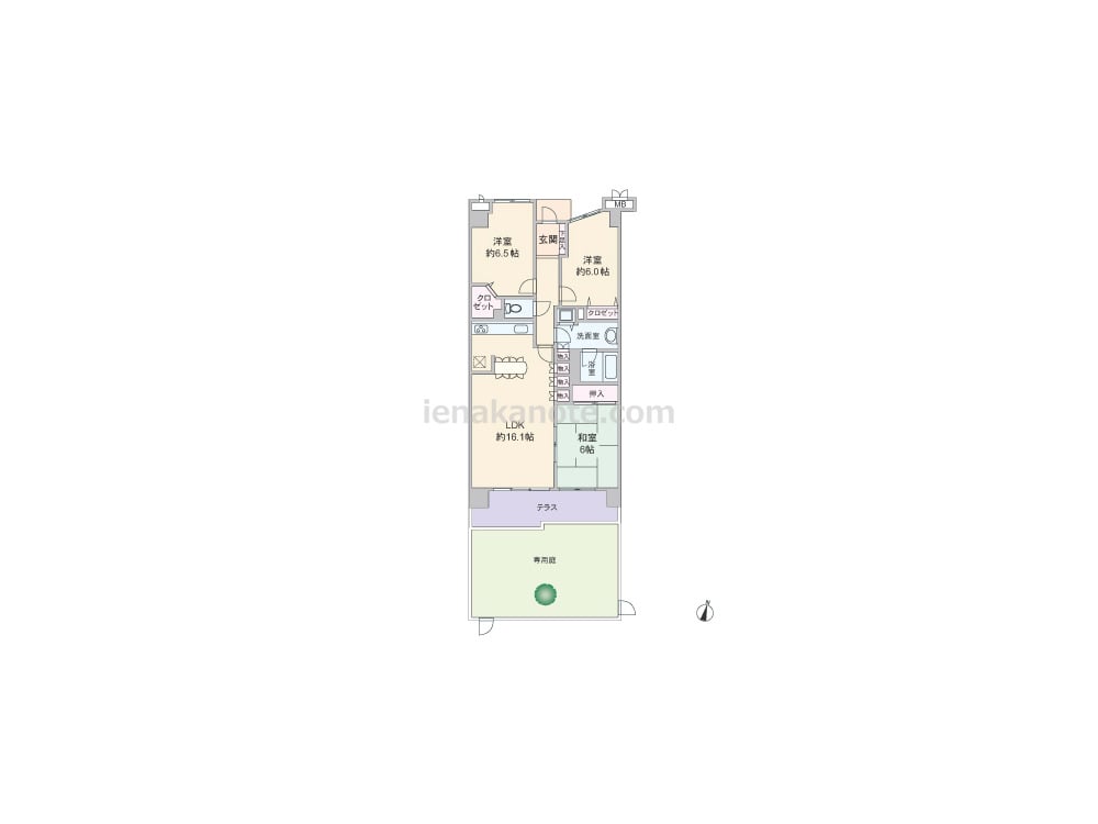 専有面積78.11平米の3LDK。全部屋6帖以上の広さがあり、各部屋に収納スペースがあるプラン。玄関前にアルコーブ付き。キッチンはI型、壁付けのオープンタイプで、背面に便利なカウンターがあります。LDKと和室が続き間で、繋げて約22.1帖の一つの空間としても使用可能。リビング・ダイニングに面してテラスと専用庭があり、ガーデニングや家庭菜園なども気軽に楽しめます。