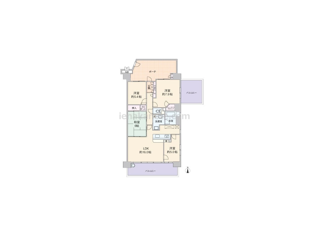 専有面積86.40平米の3LDK。玄関前に広々としたポーチがある直接共用廊下に面する居室のないプライバシーに配慮されたプラン。キッチンは家事中も家族とコミュニケーションがはかれ、かつリビング・ダイニングに生活感が出にくい、カウンター付きの半独立型。LDKと和室が続き間で、約22帖の一つの空間としても使用可能。和室は廊下からの直接アクセスでき、客間や個室としても使いやすくなっています。浴室に窓があり、換気がよく快適。主寝室は約7.9帖の広さがあり、ウォークインクロゼットとルーフバルコニー付き。ルーフバルコニーはアウトドアリビングやガーデニングスペースとしても空間を楽しめます。
