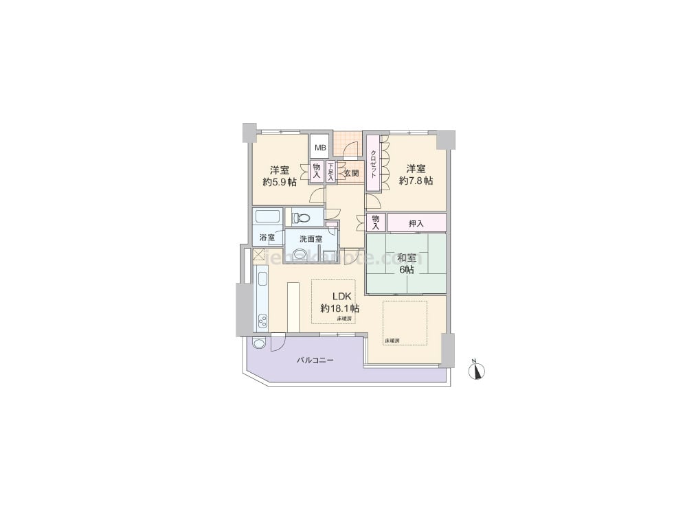 専有面積86.41平米の3LDK。LDK約18.1帖大には一部コーナーサッシが用いられ、明るく開放感があります。また、隣接する和室6帖の襖を開放すれば、約24.1帖大の空間としても利用可能。キッチンはI型の壁付け・オープンタイプ。背面にはカウンターが設けられ、キッチンからバルコニーへの勝手口があるのもポイントです。各居室と室内廊下に収納スペース付き。バルコニー約14.05平米にはスロップシンクがあり、ゆったりとガーデニングを楽しむ事が出来ます。