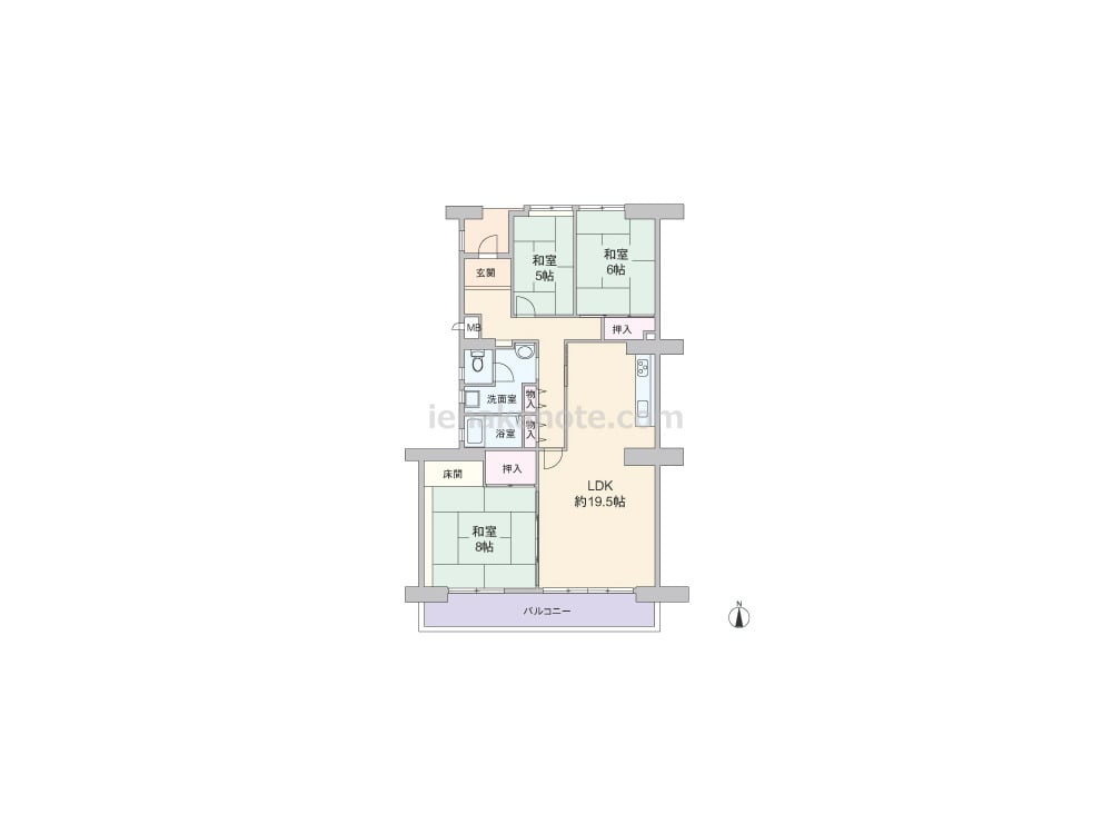 専有面積89.37平米の3LDK。LDK以外は和室の落ち着いたプラン。玄関前にポーチがあり、玄関から居室が見通せない造りでプライバシーに配慮されています。LDKは約19.5帖大と広く、和室8帖の襖を開放すれば約27.5帖大の空間に。和室5帖には収納スペースが無いため、収納家具を置くなどの工夫が必要です。トイレ・洗面室・浴室には吹抜に面して窓があり、トイレは洗面室を通って出入りします。バルコニーは約11.35平米とゆとりがあり、ガーデニングを楽しむのによさそうです。