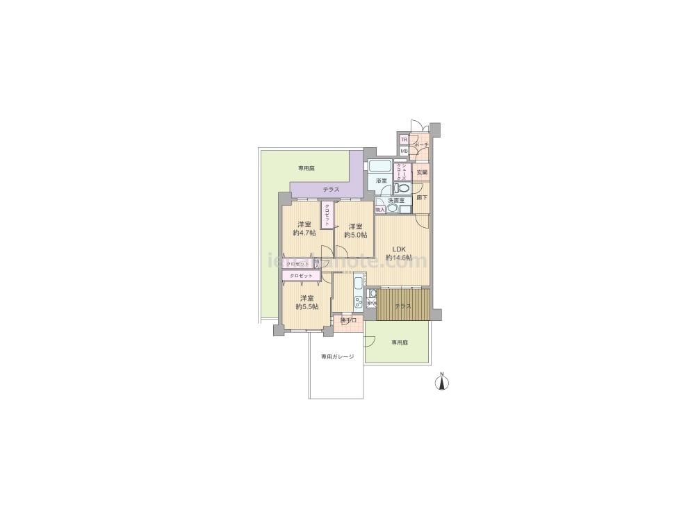 専有面積75.97平米の3LDK。専用庭・専用ガレージが付いたプラン。玄関前には専用ポーチとトランクルーム、玄関横には収納力のあるシューズクロークがあります。キッチンは作業をしながらリビングの様子をうかがえ、キッチン横の勝手口から専用ガレージへ行き来が可能。どの部屋もLDKを通ってアクセスするため、家族のコミュニケーションの機会が増えます。浴室には換気に配慮された窓があるのもポイント。LDKに面するウッドデッキ仕様のテラスにはスロップシンクがあり、ガーデニングを楽しんだり、アウトドアリビングの利用にぴったりです。